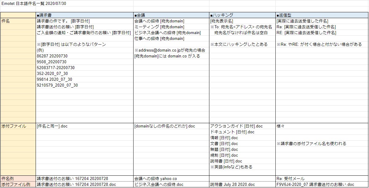 h/t @sugimu_sec: @sugimu_sec 2020/07/30の日本語 #emotet の件名まとめ