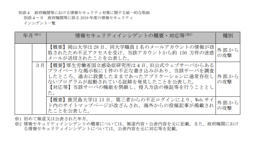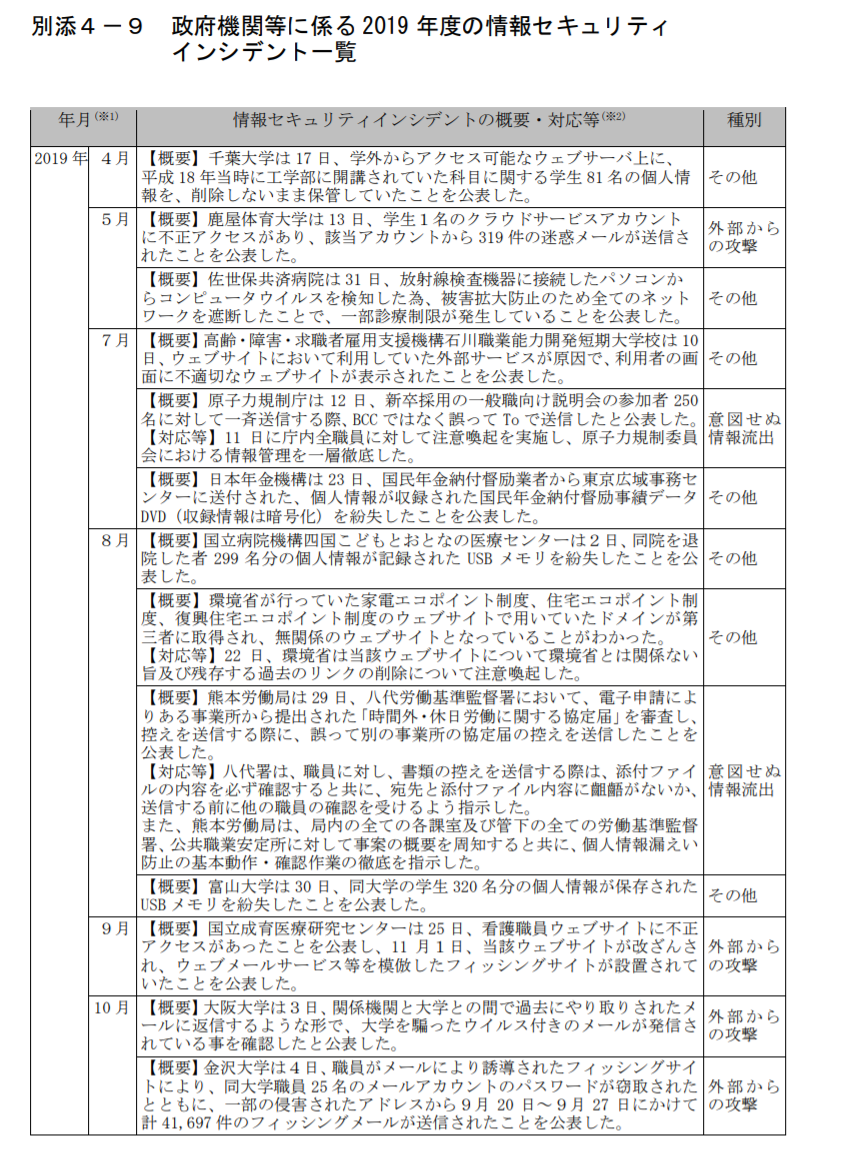 【転載】政府機関等に係る 2019 年度の情報セキュリティインシデント一覧