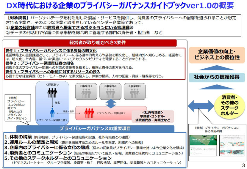 これらを踏まえて両省では、8月12日まで実施した意見募集を踏まえて同ガイドを策定、「Society5.0」の時代における企業の役割、プライバシーの考え方、企業のプライバシーガバナンスの重要性を前提に、「経営者が取り組むべき三要件」「プライバシーガバナンスの重要事項」などを取りまとめた。