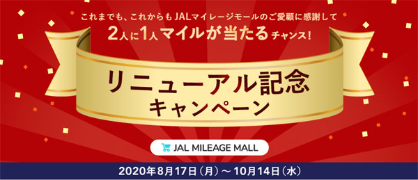 キャンペーンの詳細は、期間中にキャンペーン参加登録を行い、JALマイレージモールの「リニューアル記念キャンペーン」参加店舗で、合計5,000円(税・送料含まず)以上利用されたJMB会員が対象で、2人に1人の確率でマイルがプレゼントされるキャンペーンです。