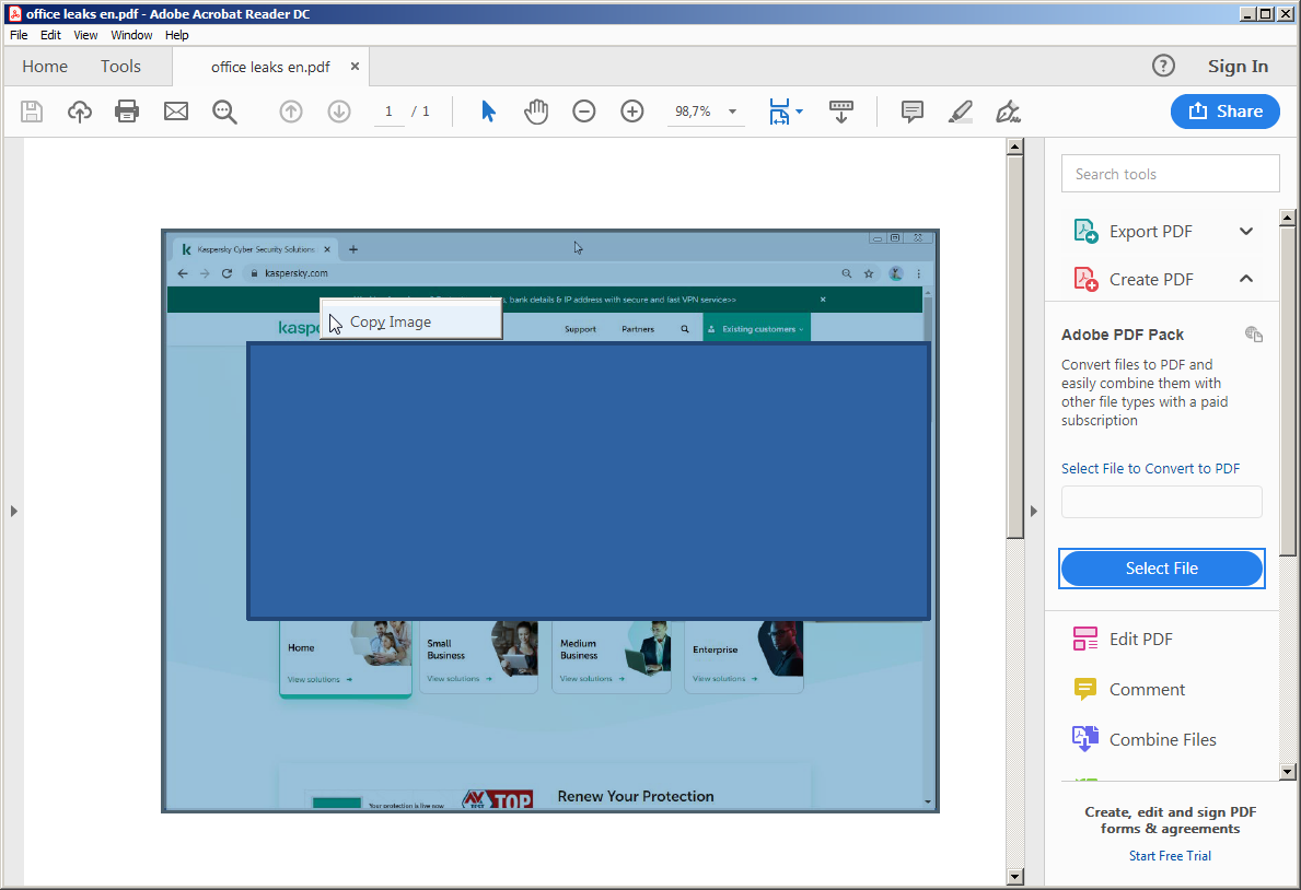 お客様宛てにパンフレットを送ろうとしているところだとしましょう。あなたは、パンフレット内のある写真に、同僚の個人情報が映っていることに気付きました。そこで、会社のコンピューターに入っているAdobe Acrobatの有料版を使い、黒の長方形でその情報を隠しました。これで大丈夫、そう思ったのですが…