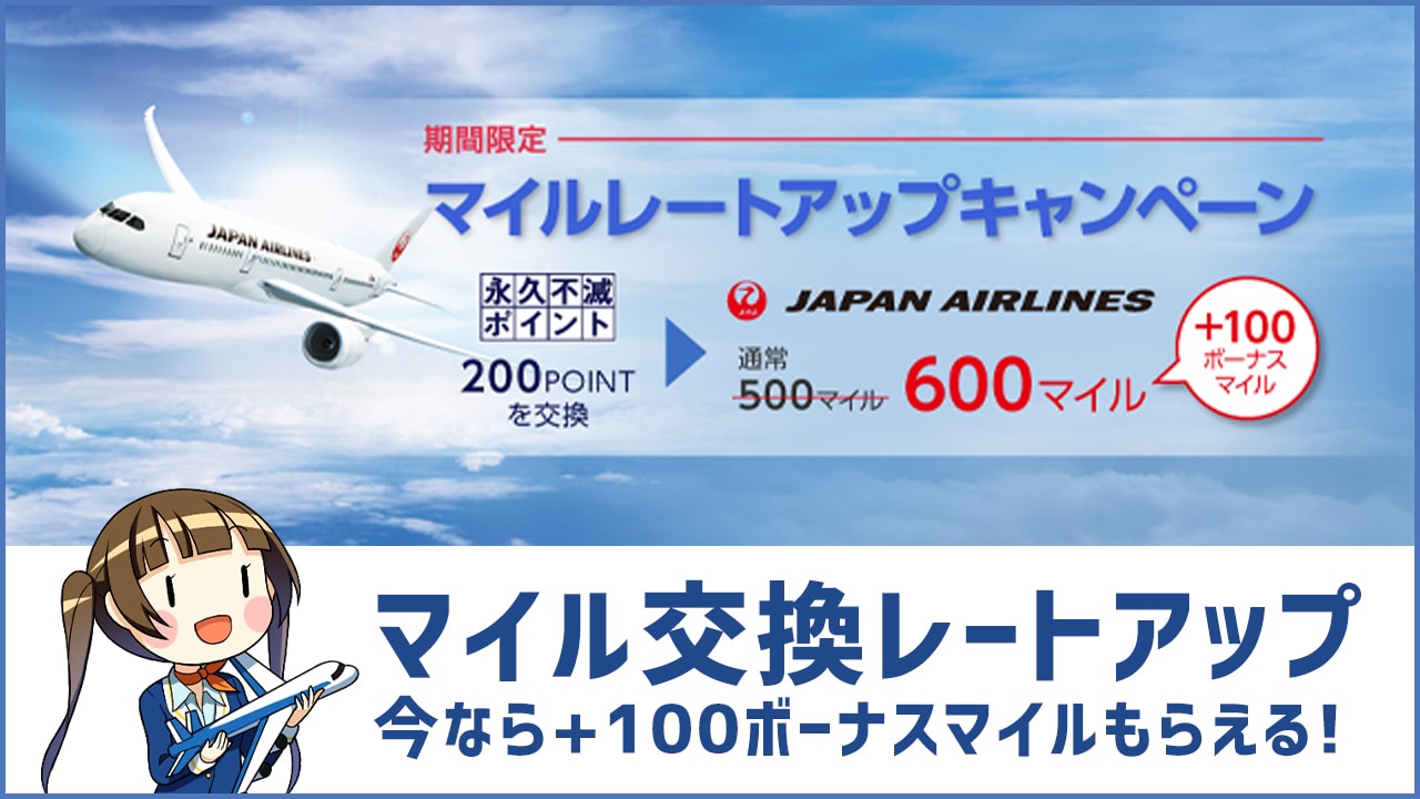 通常200永久不滅ポイントで500JALマイルと交換できるところ、キャンペーン中は+100ボーナスマイルがプレゼントされるようになります!
