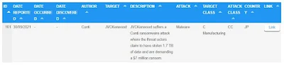 JVCケンウッドがContiランサムウェア攻撃を受けました。この攻撃では、脅威となる人物が1.7TBのデータを盗んだと主張し、700万ドルの身代金を要求しています。