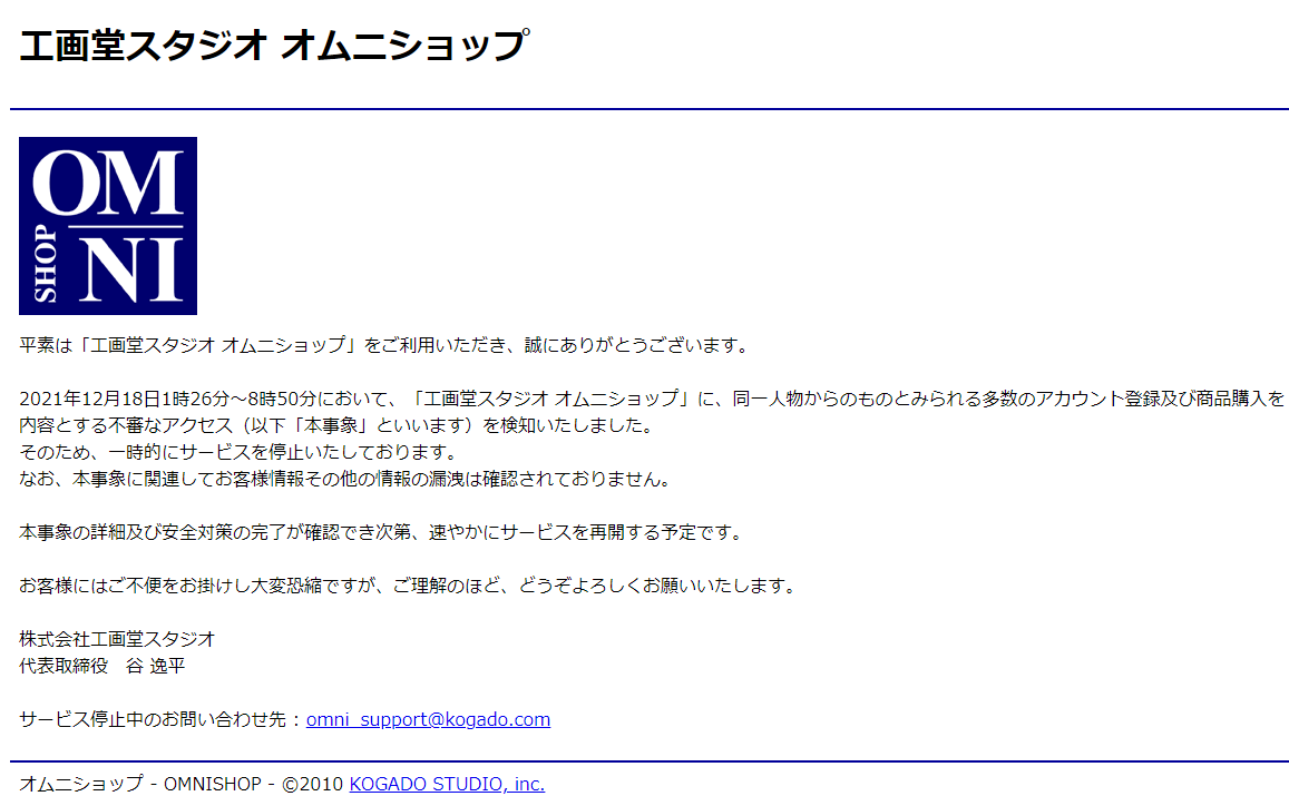 工画堂スタジオのECサイトが閉鎖中だったので、このサイトからカード情報漏えいが発生したのかと思ったのですが、「同一人物からのものと見られる多数のアカウント登録及び所品購入を内容とする不審なアクセスを検知」した事が公表されていますので、スキマーを使ったECサイトの侵害からのカード情報漏えいというよりは、他で入手されたカード情報が、このECサイトで不正利用された可能性の方が高い気がします。