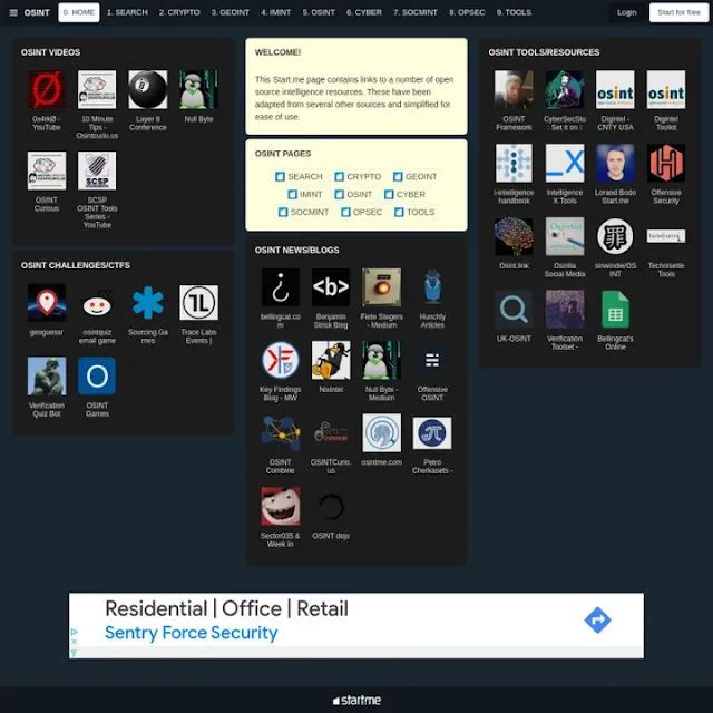 多くのビデオ、ニュースサイトやブログ、ツール、Search、Geoint、Cryptoなど他のページへのリンクがある素晴らしいOSINTコレクションです。使いやすいように簡素化されています。