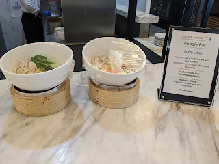 ヌードルバーがあり、チキンのヌードルとカレーラクサから選べた。カレーラクサは前日にMadam Kwan'sで食したので、チキンヌードル(写真左)を頂く。