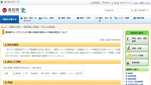 森づくり推進課がアジア航測株式会社に委託し、運営している登録制の「高知県スマート林業総合支援サイト」で公開したファイルの一部に個人情報を含むデータが掲載され、サイト利用のために登録されている事業者より一定期間(令和5年5月17日~8月24日)取得可能な状態となっていました。