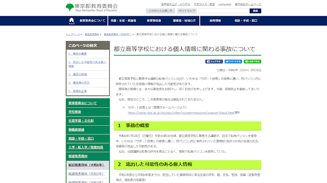 令和6年7月28日(日曜日)午前10時30分頃、都立高等学校に勤務する講師が、自宅で私物パソコンを使用中、いわゆる「サポート詐欺」の被害に遭い、同パソコン内に保存されていた勤務校3校計326名の生徒の氏名、成績等が流出した可能性がある。
